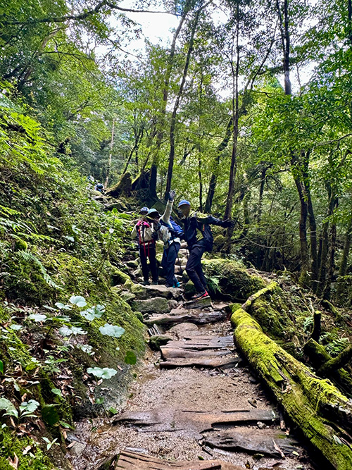 雲水歩道の一部が通行止めとなっていたため、今回は楠川歩道を歩くことに。初来島のN夫妻は、歩くうちに少しずつ表情が柔らぎ、私もつられて笑顔になる。数日前の大雨で沢の水量が増しており、最初の渡渉では岩を大きく飛び越えなければならなかった。道の一部は小川のように水が流れ、森の苔はしっとりと潤い、陽の光を受けてキラキラと輝いていた。