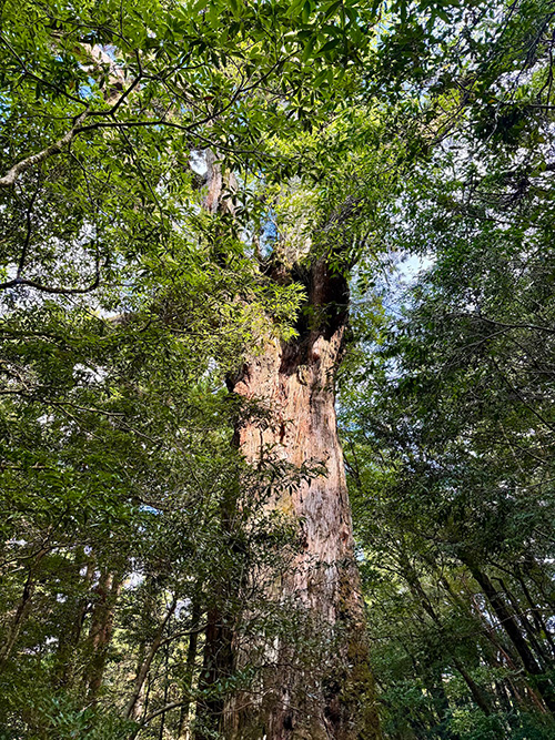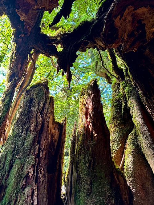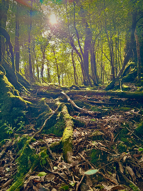 苔むす森でゆっくり休憩を取ったあと、太鼓岩を目指してさらに歩を進める。森は次第に深まり、時折現れる木々の造形から、自然の逞しさと静かな迫力を感じた。