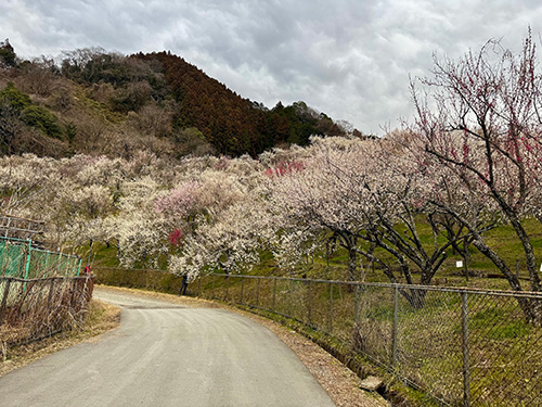 山道を抜けて平坦な道に出ると、梅林が見えてきた。この日はまだ中には入れなかったが、外からでも十分に楽しめた。咲き具合は六分ほど。白、淡いピンク、そして濃い紅色の梅が混ざり合い、どこか神秘的な風景をつくっている。
